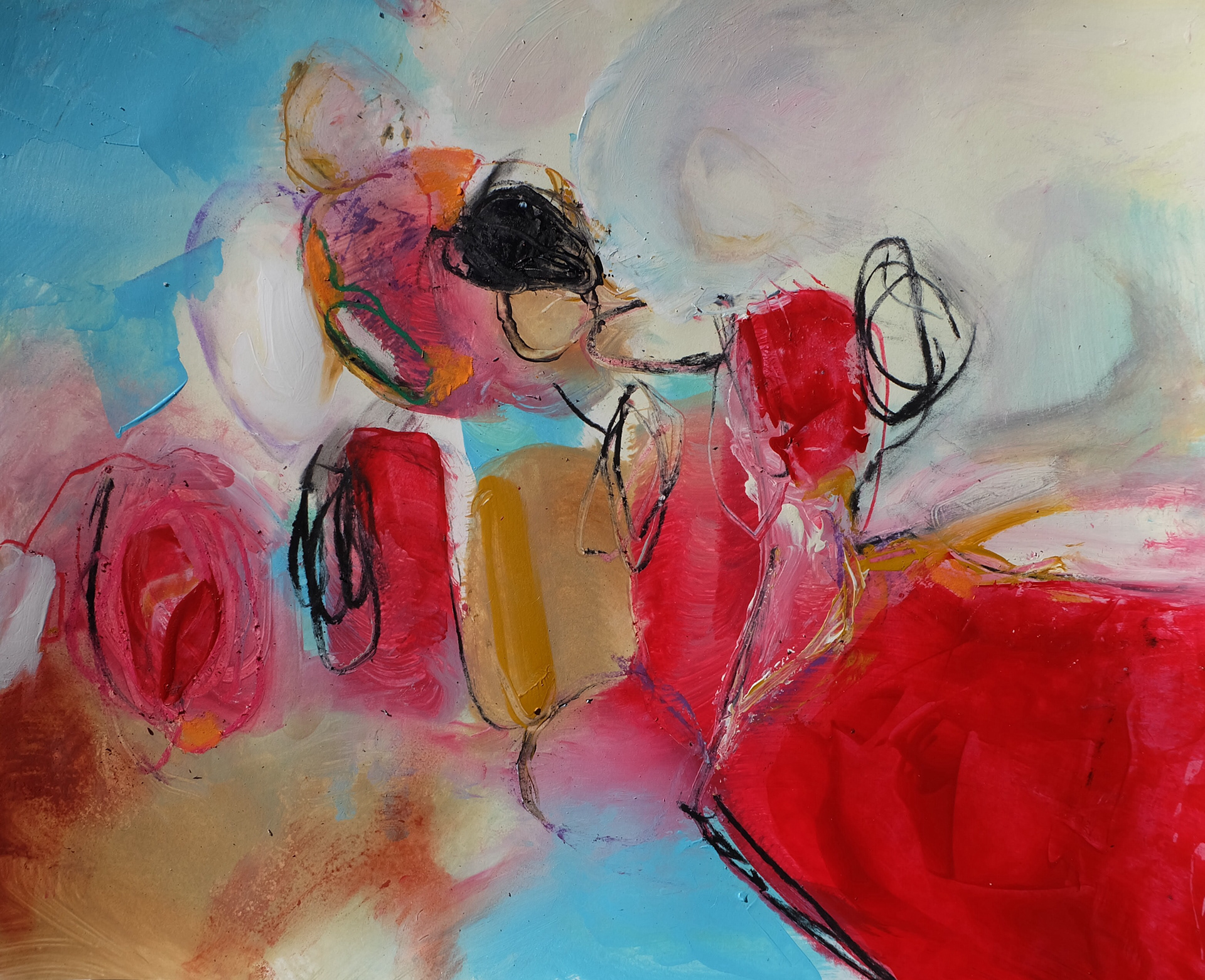 Colours: reds, blacks, cadmium blue, yellow, white,